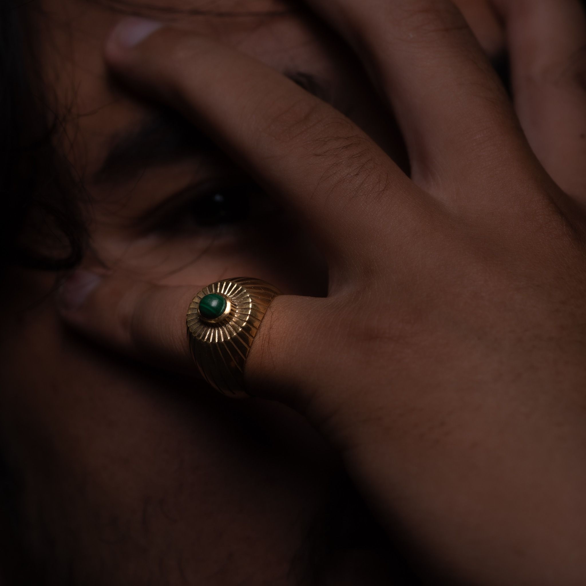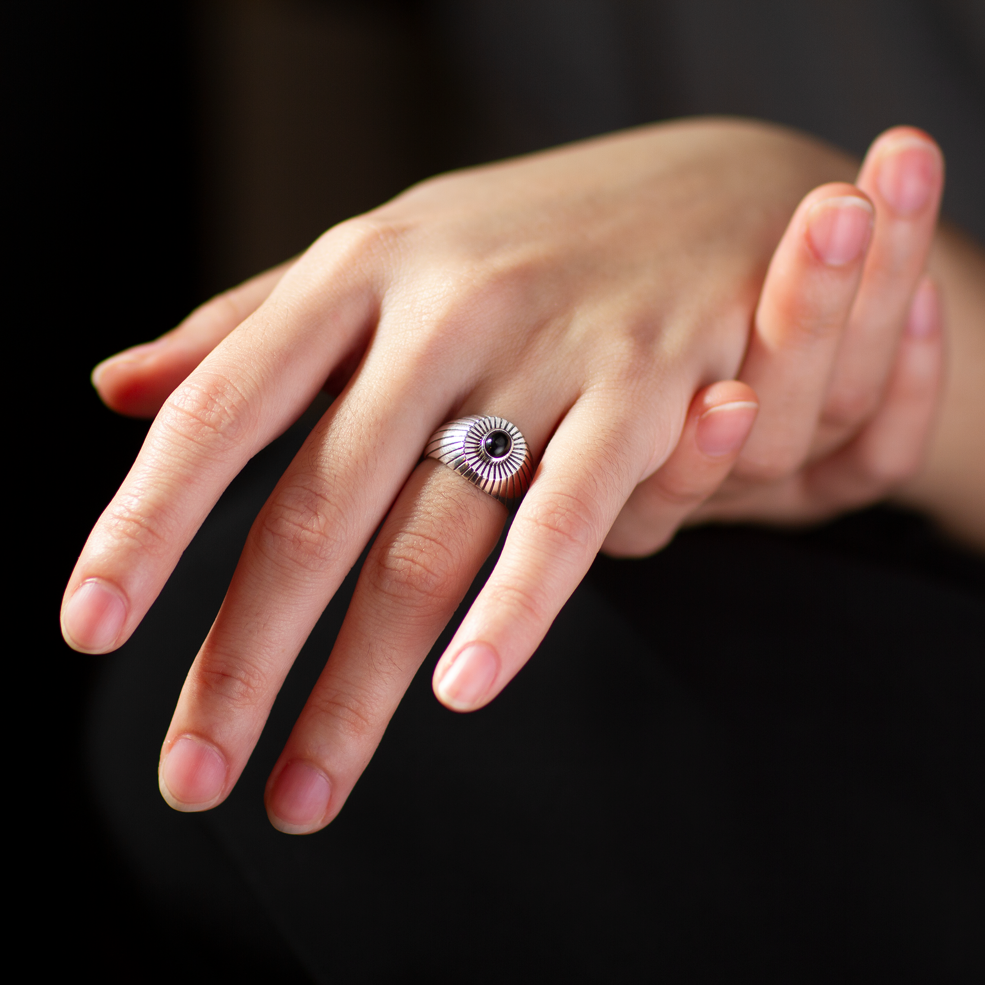 Ấn tượng tuyệt đối từ cái nhìn đầu tiên, Doong Art đã thiết kế lại những đường nét của kiểu nhẫn signet cổ điển để tạo nên chiếc nhẫn "Toả". Thay đổi chút cấu tạo của bề mặt nhẫn nhưng vẫn giữ lại những gì là đặc trưng cố hữu nhất - kết hợp cùng một viên đá thạch anh đen hay malachite, hay bất cứ loại đá quý và bán quý nào mà bạn ưa thích, chiếc nhẫn vừa tôn tính cổ điển vừa là nhận diện riêng đầy cá tính của bạn.